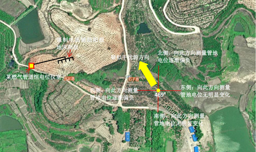 (3)確認(rèn)干擾源。對西北方向丘陵西側(cè)進(jìn)行排查,在道路旁發(fā)現(xiàn)一處密封小房屋,經(jīng)墻上電話聯(lián)系確認(rèn)為某燃?xì)夤艿缽?qiáng)制電流陰極保護(hù)站,輔助陽極地床位于該小房屋東南側(cè)農(nóng)田中,與初步判斷的雜散電流干擾源方向相符。經(jīng)聯(lián)系該燃?xì)馄髽I(yè)停用陰極保護(hù)恒電位儀后,測試469#管地電位恢復(fù)正常;啟用該恒電位儀后,重新處于干擾狀態(tài)。反復(fù)啟停恒電位儀測試確認(rèn),該處強(qiáng)制電流陰極保護(hù)系統(tǒng)陽極地床為原油管道469#測試樁靜態(tài)直流雜散電流干擾源。如圖 2所示。