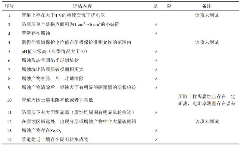 管道缺陷處腐蝕產(chǎn)物的pH值為10,土壤pH值為9.27,均呈堿性。管道泄漏點土壤電阻率低于距管道20 m處土壤電阻率,但整體數(shù)據(jù)偏大,具體原因尚待進(jìn)一步分析。本實驗缺少管道交流干擾電流密度、陰極保護(hù)極化電位及陰極保護(hù)電流密度的連續(xù)測試數(shù)據(jù)。但根據(jù)GB/T 50698―2011《埋地鋼質(zhì)管道交流干擾防護(hù)技術(shù)標(biāo)準(zhǔn)》附錄B—交流腐蝕的識別給出的評估內(nèi)容,可獲得交流腐蝕評估表(表 3)。檢測結(jié)果可提供大部分判斷依據(jù),初步判定該管道腐蝕失效原因為交流干擾引起的腐蝕。