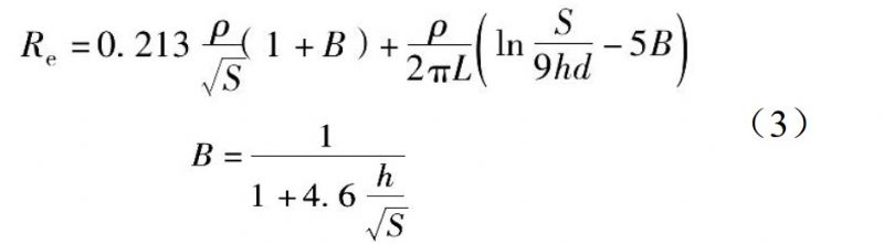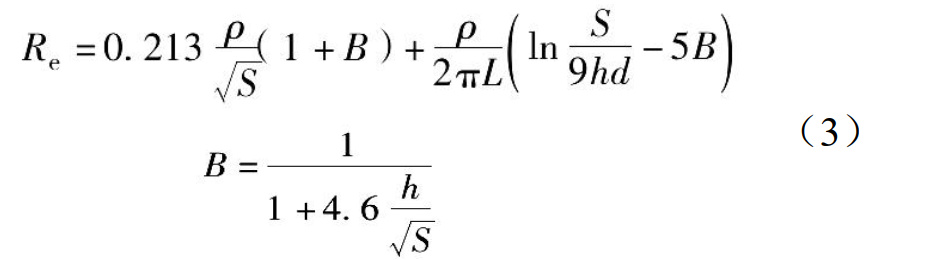(2)水平接地極為主邊緣閉合的復合接地極的接地電阻按式(3)計算: