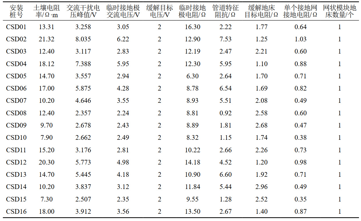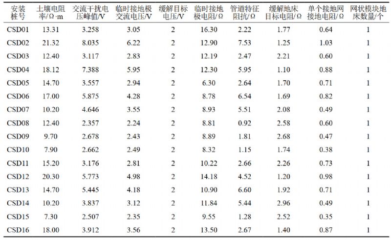 表 1 交流干擾緩解網(wǎng)狀地床安裝位置及參數(shù)指標