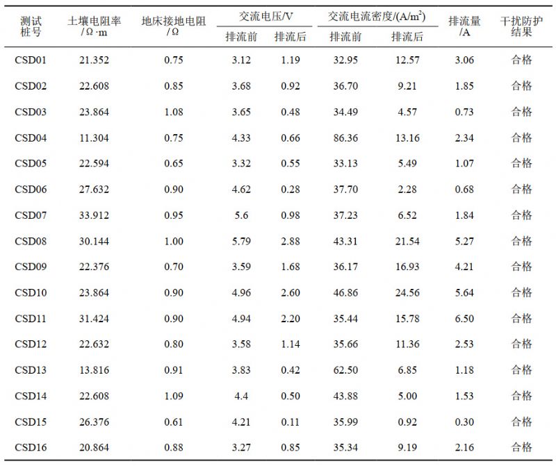 從表 3可看出,排流后的交流電壓均小于4 V,交流電流密度均小于30 A/m2,達到預期排流目標。