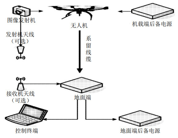 (2)長(zhǎng)時(shí)滯空視頻監(jiān)控。普通旋翼無人機(jī)在空中停留時(shí)間過短,致使連通性、移動(dòng)性和大容量之間相互矛盾,系留多旋翼無人機(jī)小巧輕便,在100 m高度系留懸停時(shí)仍有10 kg以上的載荷搭載能力,并且采用地面電源持續(xù)供電工作,沒有續(xù)航時(shí)間限制,而且開設(shè)迅速、無需空域申請(qǐng)、操作保障簡(jiǎn)單,是一個(gè)非常好的監(jiān)控通訊平臺(tái)。有效地解決搶險(xiǎn)救援中覆蓋、移動(dòng)和大容量之間的矛盾。其結(jié)構(gòu)如圖 2所示。