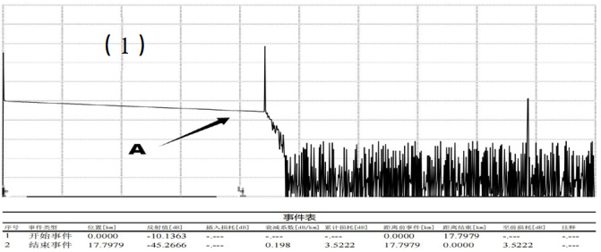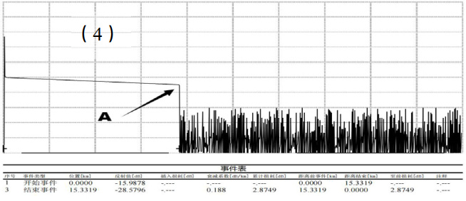 某長輸成品油管道沿線多為農(nóng)田及丘陵,同溝敷設(shè)光纜約300公里,其中輸油末站與相鄰光纜中繼站共敷設(shè)17.8公里光纜,采用2芯主用,2芯熱備用,剩余4芯冷備用的配置方式。某次月度檢測發(fā)現(xiàn),該段光纜存在損耗點且有隨時間推移損耗逐漸增大趨勢(圖 3)。1號波形為該段光纜正常檢測結(jié)果,2號波形A點處出現(xiàn)損耗臺階并隨時間推移形成3號波形A點損耗臺階,在制定光纜維修方案期間形成4號波形A點處光纜中斷點,并導(dǎo)致該熱備用芯無法正常投用。
