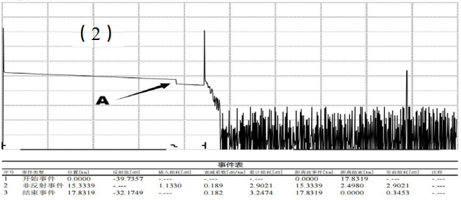 (3)光時域反射儀難以在超短距離(2 m~3 m)內(nèi)識別出故障點,不同型號設(shè)備其檢測盲區(qū)也不相同,需要使用備用光纖以檢測盲區(qū)范圍內(nèi)的故障點。一般采用200 m~1000 m的備用光纖,并逐芯熔接檢測。檢測時盡可能采用小的脈寬,以提高檢測精度。