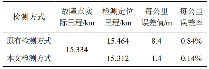 通過使用上述四種方法,本次檢測定位將光纜故障點每公里誤差率從8.4%降至1.4%,極大程度提高了故障點的定位精度(表 1)。