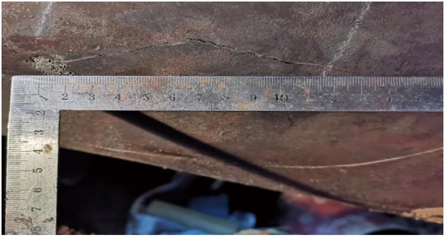 接報后,衛(wèi)輝站和新鄉(xiāng)處先后啟動站應(yīng)急預(yù)案和處應(yīng)急預(yù)警,并于17時36分采取停輸措施。隨后應(yīng)急人員攜帶挖掘設(shè)備到達(dá)現(xiàn)場。管道泄壓后,搶修人員現(xiàn)場開挖長8 m、寬3 m、深約3 m作業(yè)坑,未發(fā)現(xiàn)管道泄漏點,土壤中僅斷續(xù)存在點絮狀油跡。剝離管道防腐層,導(dǎo)通流程利用高程余壓尋找漏點,衛(wèi)輝站出站壓力最高升至0.7 MPa,未查到漏點。隨后中洛線濮陽站啟一臺輸油泵繼續(xù)排查漏點,出站壓力升至2.1 MPa,在管道順油流方向9點鐘位置發(fā)現(xiàn)一處長約11 cm母材裂縫(圖 2),有原油滲出。經(jīng)反復(fù)排查確認(rèn)無其他滲漏點后,中洛線再次停輸,處應(yīng)急指揮中心研究確定搶修方案,對裂縫處進(jìn)行長補板臨時修復(fù)(圖 3)。 補板完畢,確認(rèn)具備啟輸條件,終止站級預(yù)案,解除處級預(yù)警。