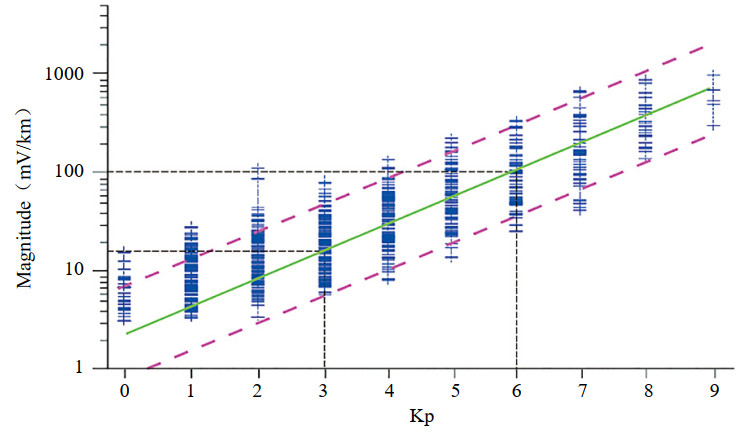 地磁活動(dòng)可以用Kp指標(biāo)來(lái)表征。Kp指數(shù)是由全球地磁臺(tái)網(wǎng)中13個(gè)地磁臺(tái)站的K指數(shù)計(jì)算得到,用于表示全球地磁活動(dòng)性,每3小時(shí)采集一個(gè)值。Kp指數(shù)是基于3小時(shí)間隔的算術(shù)平均數(shù)。該指數(shù)是對(duì)數(shù)值,范圍從0(靜止)到9(嚴(yán)重),Kp指數(shù)超過(guò)4的活動(dòng)被認(rèn)為是地磁暴。隨著Kp指數(shù)增大,地磁暴發(fā)生的概率對(duì)數(shù)地減小。一般把Kp=5、6稱(chēng)為中小地磁暴,Kp=7、8、9稱(chēng)為大地磁暴。由圖 1可知,地磁小擾動(dòng)頻繁發(fā)生,但嚴(yán)重的地磁暴幾乎不發(fā)生。Kp=6的地磁暴可能發(fā)生的概率為2%,可產(chǎn)生平均100 mV/km大小的地電場(chǎng),其電場(chǎng)范圍大致是30 mV/km~300 mV/km(圖 2)。