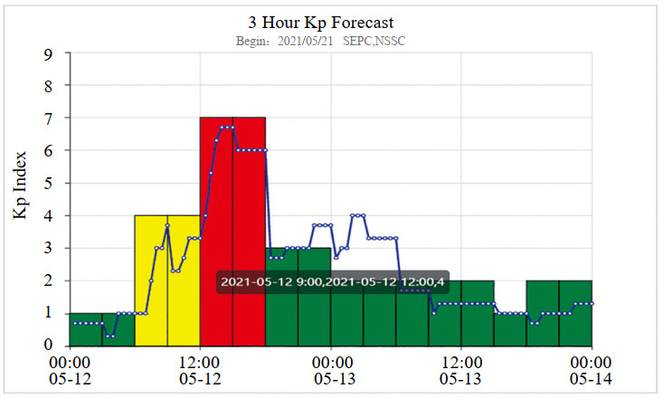 2021年5月,通過(guò)對(duì)某管線上智能電位測(cè)試樁監(jiān)測(cè)數(shù)據(jù)分析,發(fā)現(xiàn)沿線智能電位測(cè)試樁通電電位和斷電電位均存在持續(xù)不規(guī)則波動(dòng),波動(dòng)趨勢(shì)一致,但均未呈現(xiàn)出明顯的隨時(shí)間變化的周期性特點(diǎn),也無(wú)明顯的靜息期,如圖 3所示。經(jīng)查詢空間環(huán)境預(yù)報(bào)中心網(wǎng)站(圖 4),5月12日12:00—18:00這段時(shí)間內(nèi)發(fā)生Kp=7的大地磁暴事件,因此該時(shí)段內(nèi)管道受到的地磁干擾相較于其他時(shí)間明顯增強(qiáng),表現(xiàn)為通電電位波動(dòng)幅度顯著增大,且斷電電位波動(dòng)幅度也有所增大。
