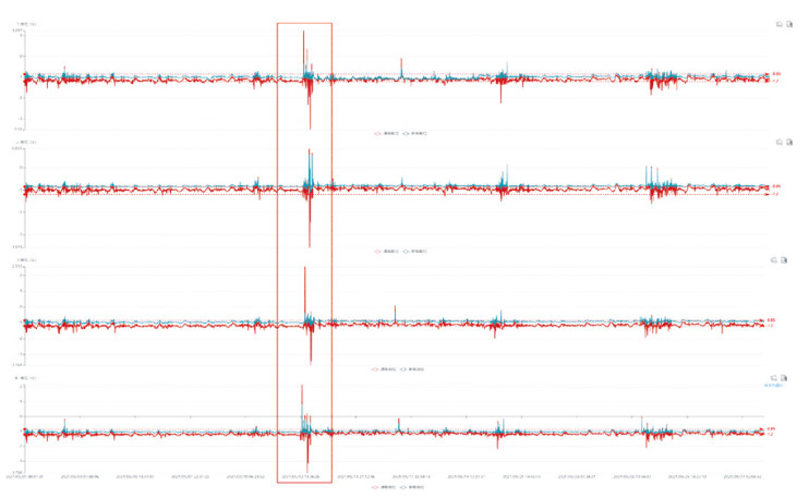 圖 3 2021年5月12日大地磁暴( Kp=7)時(shí)某管線4處智能測(cè)試樁的監(jiān)測(cè)電位-時(shí)間分布圖