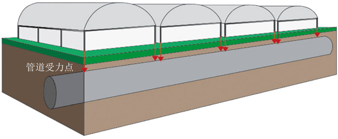 (5)長期承壓易造成管道變形。若油氣管道與大棚走向并行,此時管道受大棚的重力荷載基本為零,但此類情況較小,大多數(shù)情況管道走向與大棚走向會出現(xiàn)交叉甚至重疊(圖 1),此時管道在一定長度內(nèi)會出現(xiàn)若干個集中受力點(diǎn)。隨著科技的發(fā)展,溫室大棚技術(shù)越來越智能化,加上了供水系統(tǒng)、溫控系統(tǒng)、輔助照明系統(tǒng)及濕度控制系統(tǒng)等功能,為保證承重結(jié)構(gòu)和防止出現(xiàn)不均勻沉降,基礎(chǔ)采用鋼筋混凝土澆筑或條石砌筑的圈梁,整體的配置和重量也越來越接近廠房,管道長期在大棚基礎(chǔ)傳遞的外部荷載下會出現(xiàn)局部高應(yīng)力狀態(tài),產(chǎn)生彎曲和變形,影響內(nèi)檢測儀器通過,嚴(yán)重時會發(fā)生火災(zāi)爆炸等事故。