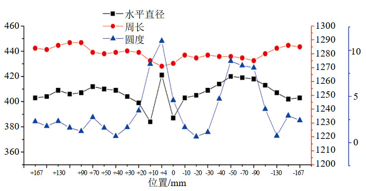 在彎管外表面標(biāo)記軸向等間距分布的環(huán)套,相鄰環(huán)套軸向間隔100 mm。采用直尺投影法測量每個(gè)環(huán)套水平直徑,采用軟尺測量周長,并計(jì)算圓度,計(jì)算證明彎管變形后直徑和圓度出現(xiàn)了不均勻現(xiàn)象,其中屈曲處和下游變形較大,屈曲上游變形較小,計(jì)算結(jié)果如圖 2所示。
