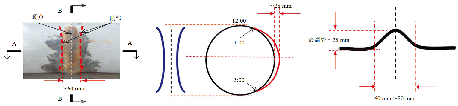 采用游標(biāo)卡尺對屈曲高度和寬度進(jìn)行測量。屈曲環(huán)向分布于外弧側(cè)1:00至5:00,最大高度位于3:00,高約28 mm,屈曲軸向?qū)挾燃s60 mm~80 mm(圖 3)。屈曲寬度沿環(huán)向從中間到兩邊逐漸增大,屈曲高度沿環(huán)向從中間到兩邊逐漸降低。