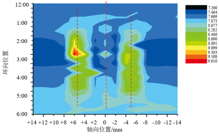 在屈曲部位畫等距網(wǎng)格,環(huán)向網(wǎng)格線以15分鐘為間隔,軸向網(wǎng)格線以20 mm為間隔(圖 4)。采用超聲波測厚儀對17×15個(gè)點(diǎn)進(jìn)行了壁厚測量,結(jié)果見圖 5,與未變形處相比,屈曲處壁厚增大。