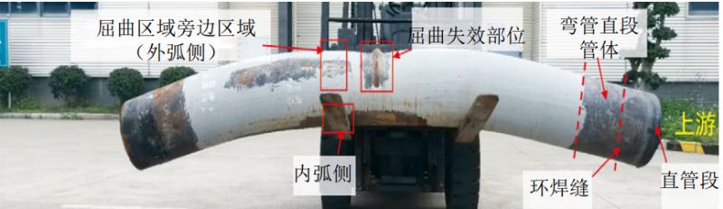 屈曲位于熱煨彎頭外弧側(cè),原環(huán)氧粉末防腐層完全脫落,內(nèi)弧側(cè)防腐層局部脫落,其他未完全脫落的防腐層存在環(huán)向裂紋(圖 1)。熱煨彎頭全長約3.4 m,其中彎管長約3.2 m,對接直管長250 mm,彎曲角27.6°。