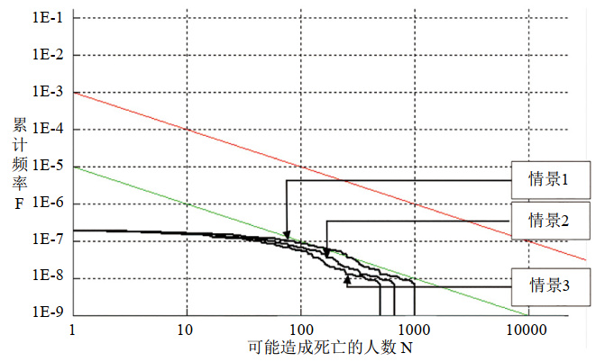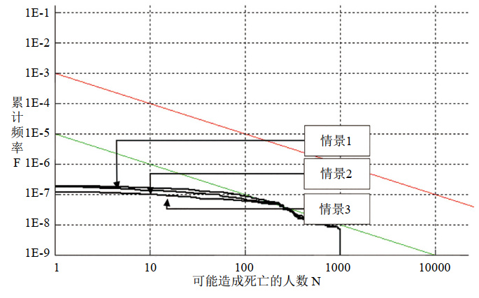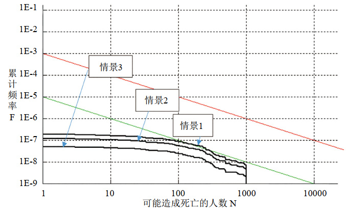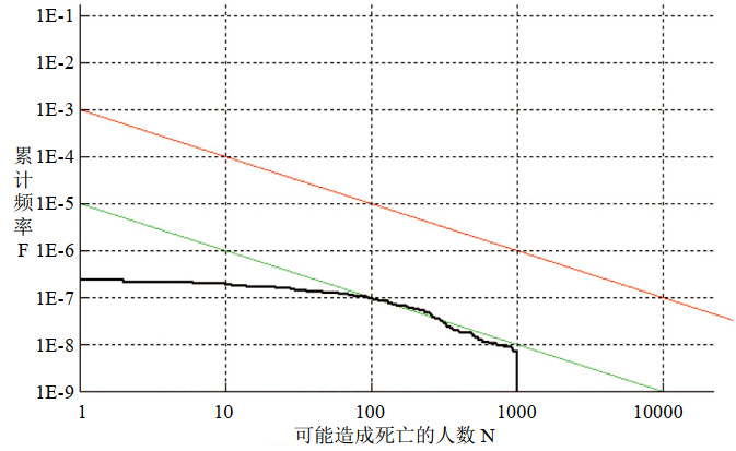 圖 2中紅線與綠線之間的區(qū)域表示可能造成死亡人數(shù)小于1000的區(qū)域?yàn)轱L(fēng)險可接受區(qū)。紅線之上以及可能造成死亡人數(shù)大于1000的區(qū)域?yàn)椴豢山邮軈^(qū)。綠線之下以及可能造成死亡的人數(shù)小于1000的區(qū)域?yàn)轱L(fēng)險可接受區(qū)。