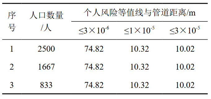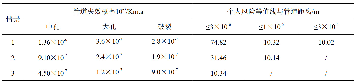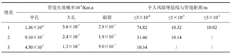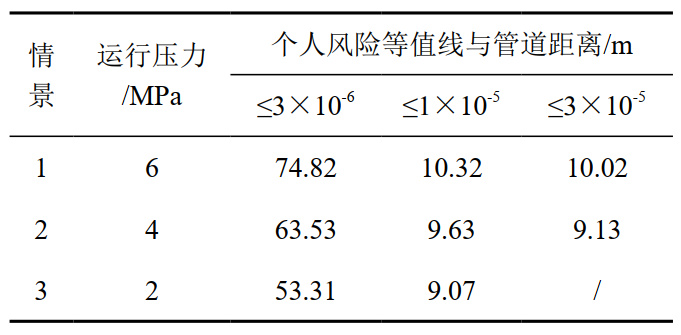 采取人口搬遷或管道改線措施,能使管道周圍人口數(shù)量降低從而達(dá)到降低管道風(fēng)險目的。情景1為現(xiàn)狀;情景2為假設(shè)其它條件不變,保持周邊人口區(qū)域位置不變,將周邊人口數(shù)量降為現(xiàn)有人口數(shù)量的2/3,一般采取改線或搬遷;情景3為假設(shè)其它條件不變,將周邊人口數(shù)量降為現(xiàn)有人口數(shù)量的1/3。依次計(jì)算得到采取措施后導(dǎo)致個人風(fēng)險等值線與管道距離的關(guān)系,計(jì)算結(jié)果(表 5)。