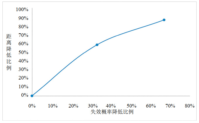 由表 2中數(shù)據(jù)結(jié)果可以看出降低失效概率可以有效降低個人風(fēng)險和社會風(fēng)險,見表 1、圖 3。當(dāng)失效概率減小為原來的67%時,3×10-6個人風(fēng)險等值線距離管道的距離降低了57.95%;當(dāng)失效概率減小為原來的33%時,3×10-6個人風(fēng)險等值線距離管道的距離降低了86.18%。從圖4中可以看出失效概率與人風(fēng)險等值線距離管道的距離呈正相關(guān)性,個人風(fēng)險值與社會風(fēng)險結(jié)果對管道失效概率值的變化都較敏感。