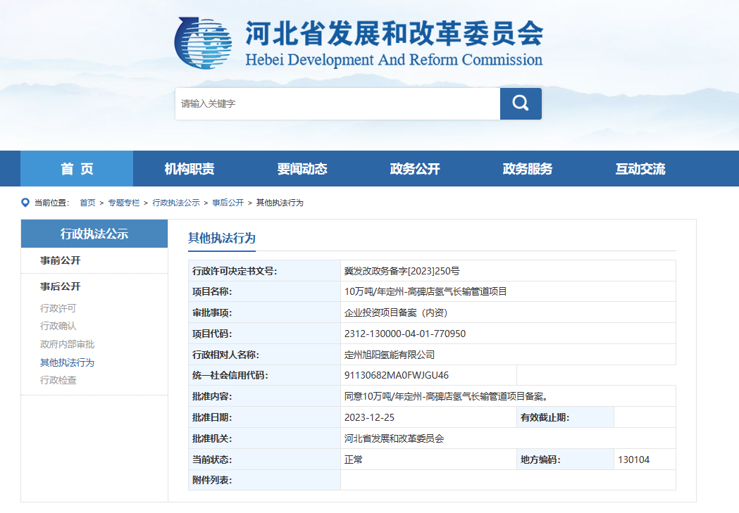 10萬噸/年定州-高碑店氫氣長輸管道項(xiàng)目備案獲河北省發(fā)展和改革委員會(huì)批復(fù)。