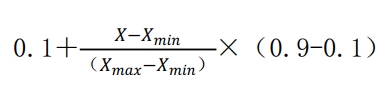 常規(guī)的歸一化處理是將原始數(shù)據(jù)映射到[0,1]或者[-1,1]之間。結(jié)合地質(zhì)災(zāi)害分析中的專家經(jīng)驗(yàn),采用公式將其轉(zhuǎn)換為[0.1,0.9]之間的浮點(diǎn)數(shù)[5-7]。
