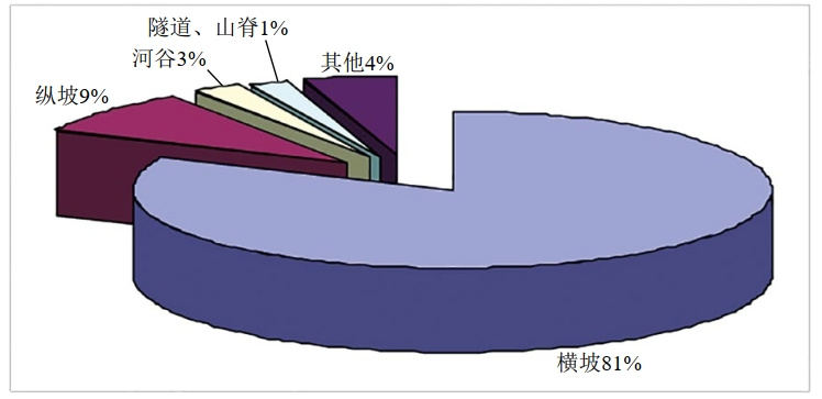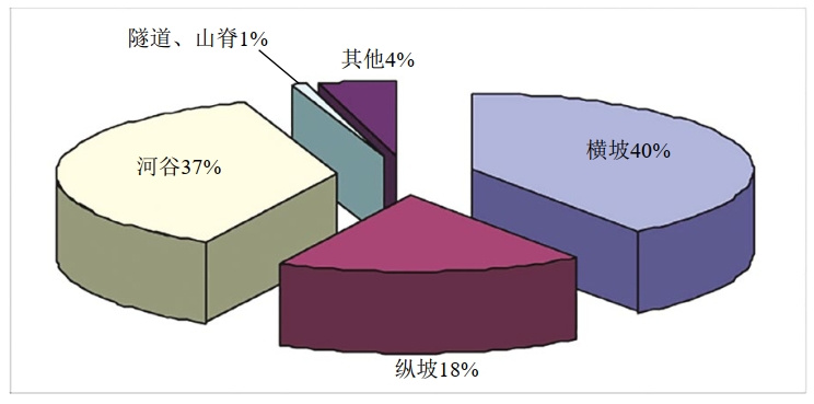 山區(qū)管道敷設(shè)方式可分為橫坡敷設(shè)段和縱坡敷設(shè)段,以澀寧蘭、蘭成渝、忠武和蘭鄭長管道2005年至2010年排查出的4084處地質(zhì)災(zāi)害為例,90%以上水毀災(zāi)害發(fā)育在河道與山谷地區(qū),崩滑流等其他災(zāi)害則主要分布在山區(qū)橫坡敷設(shè)段(圖 1、圖 2)。