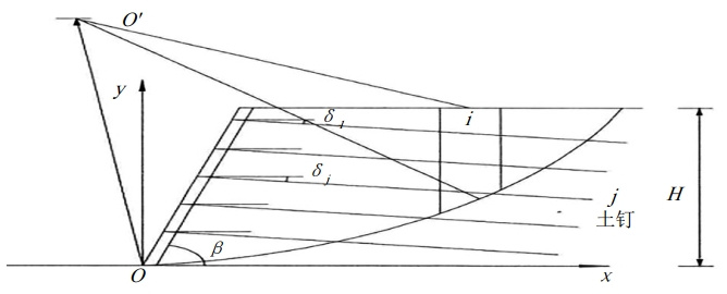 式中,F(xiàn)S為滑動面的安全系數(shù),n為土條數(shù),Ci為第 i 條塊的粘聚力,ψi 為第 i 條塊的內(nèi)摩擦角,bi為第 i 條塊底面水平方向上寬度,βi為第 i 條塊底面與水平面間的夾角,Wi為第 i 條塊重力,Li為條塊底面長,Sh為土釘?shù)臋M向間距,δj為第 j 排土釘與水平面間的夾角,Pj為第 j 排土釘提供的抗拔力,(j =1,2,...,n),Ψj 為第 j 排土釘與滑動面切線間的傾角,Ψj =ψi+δj 。