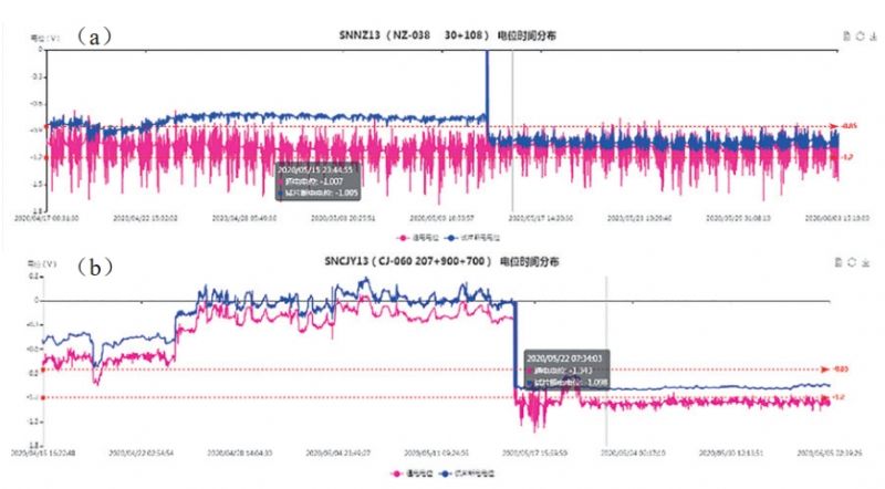 樁內(nèi)連接線(xiàn)常見(jiàn)故障有接線(xiàn)頭銹蝕、測(cè)試線(xiàn)損壞以及接線(xiàn)問(wèn)題。日常管理中需要定期給接線(xiàn)柱和線(xiàn)頭進(jìn)行打磨處理,以確保接觸良好(圖 1)。事實(shí)證明,試片接線(xiàn)和參比接線(xiàn)的良好接觸以及是否松動(dòng)都會(huì)對(duì)設(shè)備檢測(cè)結(jié)果造成影響。圖 2 a為試片接線(xiàn)端打磨處理前后通斷電電位變化情況,圖 2 b為參比線(xiàn)重新連接前后通斷電電位變化情況。試片接線(xiàn)和參比接線(xiàn)失效,其后果等同于試片和參比失效(藍(lán)色線(xiàn)條為斷電電位,紅色線(xiàn)條為通電電位,下同)。