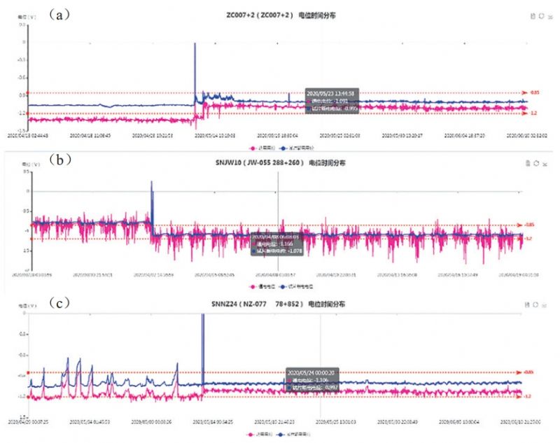 圖 3 a為SIM卡接觸不良問(wèn)題整改前后通斷電電位變化情況。SIM卡接觸不良,將導(dǎo)致電位數(shù)據(jù)無(wú)法正常傳輸,整改后,重新上傳數(shù)據(jù)。圖 3 b為重新標(biāo)定采集儀前后通斷電電位變化情況。圖 3 c為更換采集儀前后通斷電電位變化情況,采集儀屬于智能測(cè)試樁的數(shù)據(jù)處理中樞,校準(zhǔn)或維修后電位值恢復(fù)正常。