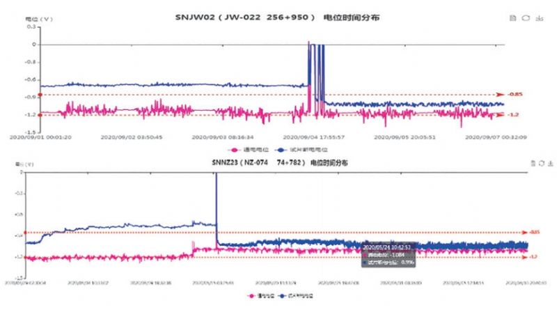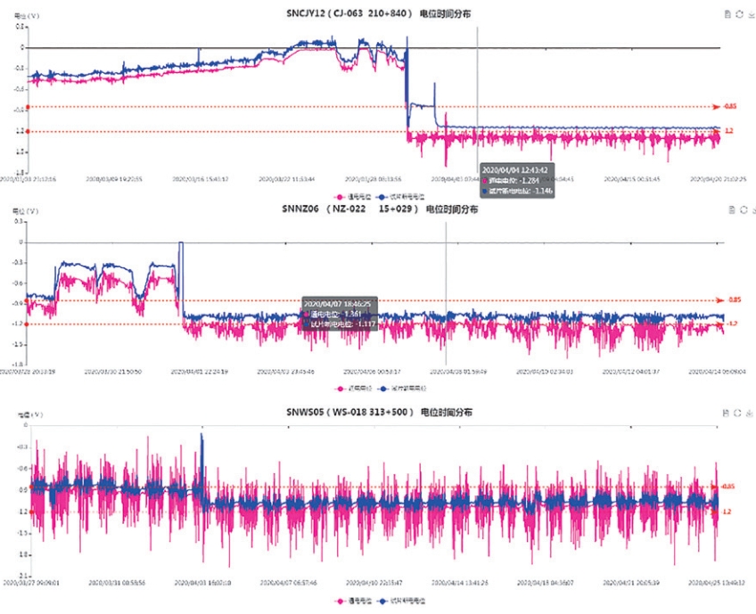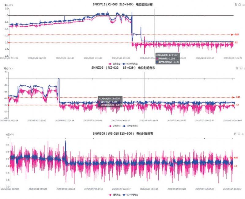 鋼制埋地輸油管道智能測(cè)試樁為管道保護(hù)提供了數(shù)據(jù)基礎(chǔ),但測(cè)試樁故障會(huì)造成陰保數(shù)據(jù)不準(zhǔn)確,F(xiàn)場(chǎng)實(shí)踐證明,不同部件的失效在電位曲線(xiàn)圖上會(huì)呈現(xiàn)不同的變化規(guī)律。做好智能測(cè)試樁樁體、智能采集儀、電源、參比電極、試片等零部件的故障排查與維護(hù),對(duì)保證電位數(shù)據(jù)的真實(shí)性具有重要的意義。