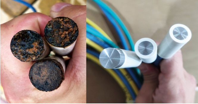 (2)試片的檢測(cè)方法。為了消除IR降,以更準(zhǔn)確地檢測(cè)出斷電電位,試片通常埋設(shè)在管道附近。SN管道上用于檢測(cè)直流斷電電位的試片面積為6.5 cm2。雖然試片與管道連接并受陰極保護(hù),但由于長(zhǎng)期埋設(shè)在地下,特別是在南方地區(qū)水位較高且長(zhǎng)時(shí)間泡在水中,會(huì)導(dǎo)致附著物或沉淀物的形成,如圖 5所示。此外,地下水位的上升或者下降也可能導(dǎo)致試片與土壤之間出現(xiàn)間隙,從而影響斷電電位的準(zhǔn)確性。
