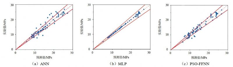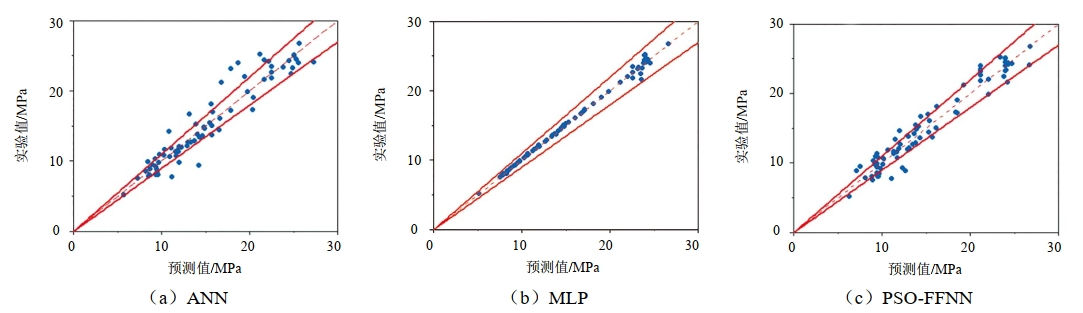 文中采用的數(shù)據(jù)來自文獻[2]中的實驗數(shù)據(jù),預(yù)測值越靠近中間的紅色虛線,預(yù)測結(jié)果越接近實驗值。虛線兩側(cè)的紅色實線表示預(yù)測值與實驗值誤差為±10%。在三種預(yù)測模型訓(xùn)練結(jié)果中,MLP模型的訓(xùn)練結(jié)果最好,所有預(yù)測結(jié)果的誤差均在±10%以內(nèi),而ANN和PSO-FFNN的訓(xùn)練結(jié)果都有部分樣本預(yù)測誤差超過了±10%(圖 4)。