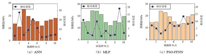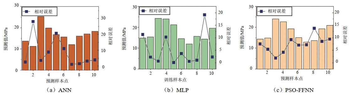 結(jié)合三種預(yù)測模型的預(yù)測結(jié)果(圖 5),柱狀圖顯示的是三種模型的預(yù)測值,折線圖顯示的是每個預(yù)測樣本點的相對誤差。可以看出,ANN模型最大相對誤差接近30%,三個樣本點相對誤差大于10%。MLP模型的最大相對誤差接近20%,三個樣本點相對誤差大于10%。而PSO-FFNN模型最大相對誤差接近15%,其余樣本點相對誤差均小于10%。從預(yù)測結(jié)果看,PSO-FFNN模型的預(yù)測結(jié)果最為穩(wěn)定。