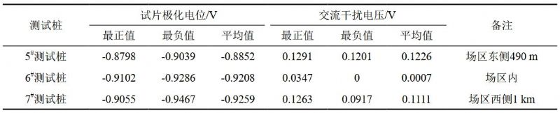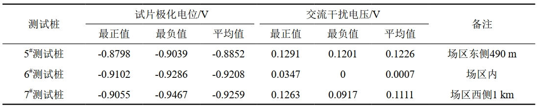 目標管道外徑426 mm,壁厚8 mm,防腐層類型為3PE,采用外加電流方式進行防護。管道5#~7#測試樁約900 m(其中約400 m與光伏組件、35 kV電纜近似平行)位于光伏發(fā)電場址內,35 kV集電線路與管道存在1處交叉。項目接地系統(tǒng)與管道最小間距約9 m(圖 1)。通過對5#~7#測試樁長時間電位監(jiān)測,采用1.0 cm²試片,監(jiān)測數(shù)據(jù)涵蓋試片交流干擾電壓、直流通/斷電電位,顯示當前干擾環(huán)境狀況下管道交流干擾小、干擾電壓最大約為0.20 V,管道交流干擾輕微,試片極化穩(wěn)定后斷電電位為﹣0.86 VCSE~﹣0.92 VCSE,管道陰極保護狀況良好(表 3)。