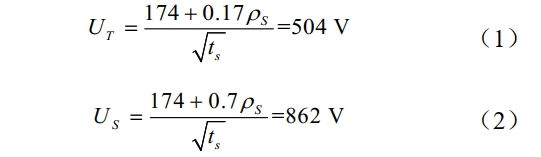 (2)箱變站單相故障下的暫態(tài)交流干擾。涂層耐受電壓參考武漢大學高壓實驗室2007年的研究項目《輸電線路接地系統(tǒng)對地下金屬管道的影響研究》中的相關研究成果,PE防腐層金屬管道的工頻耐壓取57 kV(對應的峰值電壓約80 kV);人身安全參考GB/T 50065―2011《交流電氣裝置的接地設計規(guī)范》,接觸電壓(UT)和跨步電壓(US)按式(1)、式(2)計算(故障持續(xù)時間ts取0.2 s,ρs 為土壤電阻率):