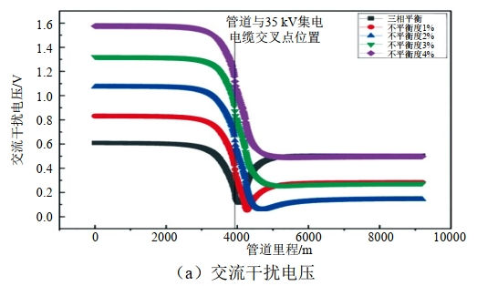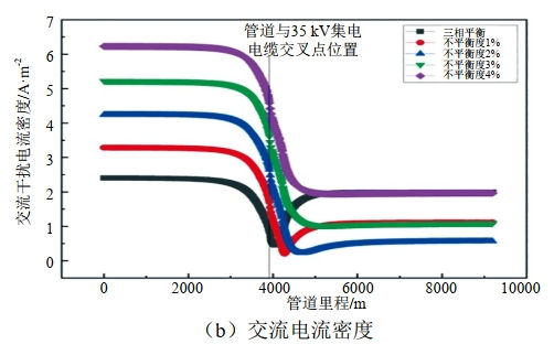 基于交流電纜交流干擾模型與輸電線路運行參數(shù),采用SES CDEGS數(shù)值模擬軟件計算評估了交流電纜于A相不同平衡度下管道交流干擾狀況,結果如圖 2和表 4所示?芍汗艿澜涣鞲蓴_電壓和電流密度隨不平衡度增加而增大,交流干擾電壓和電流密度隨管道里程的變化趨勢一致,在管道與集電電纜交叉點附近出現(xiàn)干擾峰值,交流干擾電壓最大值為1.57 V,交流電流密度最大值為6.22 A/m²,隨著管道與集電電纜相互間距的增加,沿線交流干擾程度降低,管道整體交流干擾風險弱,無須采取交流排流措施。
