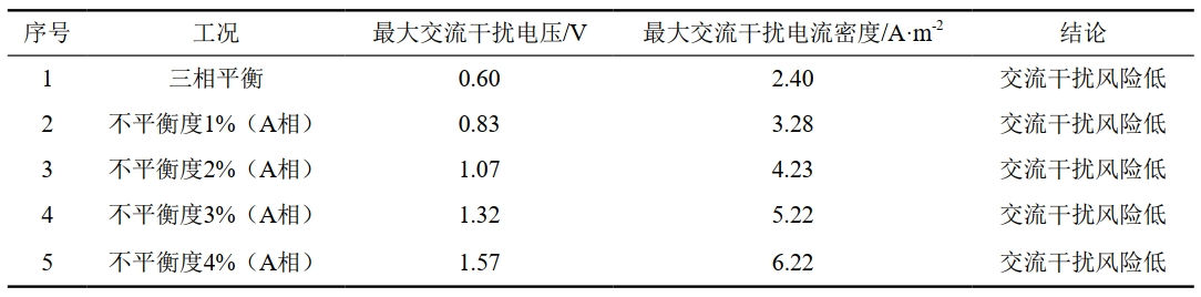 表 4 交流電纜對管道穩(wěn)態(tài)干擾