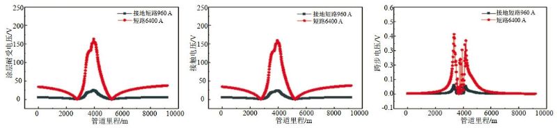 新建光伏發(fā)電項目共有箱變站10座,3#箱變站距管道11 m。因此本部分重點考慮3#箱變站發(fā)生單相故障情況下管道受交流干擾風險的評估,按照設計參數(shù),箱變站發(fā)生接地短路和短路時的故障電流分別為960 A和6400 A,故障持續(xù)時間均為0.2 s。采用SES CDEGS數(shù)值模擬軟件計算評估3#箱變站發(fā)生單相故障時管道受干擾狀況。管道涂層耐受電壓、接觸電壓和跨步電壓計算結果如圖 3所示?芍3#箱變站發(fā)生接地短路和短路故障時,涂層耐受電壓最大值分別為163.8 V、24.6 V,遠小于涂層耐受電壓安全限值,涂層損傷風險小;影響區(qū)域內管道接觸電壓最大值分別為159.7 V、23.9 V,遠小于安全限值504 V,人員接觸觸電風險小;管道沿線路跨步電壓最大值分別為0.41 V/m、0.06 V/m,遠小于安全限值862 V/m,人員跨步電壓風險小。箱變站單相故障下的管道暫態(tài)交流干擾風險低。