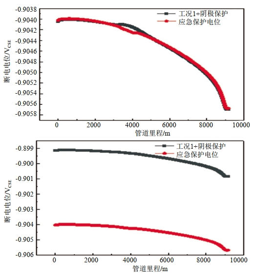 采用SES CDEGS軟件中的CorrCAD模塊建立直流干擾計算分析模型,基于現(xiàn)場土壤測試的X52鋼試樣極化曲線(圖 4)和現(xiàn)場管道陰極保護測試數(shù)據(jù),計算得到兩種工況下管道沿線極化電位分布(圖 5)?芍汗r(1)下管道電位最大偏移量約0.2 mV,基本無偏移,管道直流干擾風險低;工況(2)下管道電位最大偏移量約5 mV,基本無偏移,管道直流干擾風險低。需要指出的是,由于光伏系統(tǒng)的逆變器數(shù)量較多,單個逆變器發(fā)生故障時根據(jù)上文的計算結果可知對管道的影響較小,但如果多個逆變器同時發(fā)生故障時,可能會對管道產生明顯的直流干擾,應加以注意。