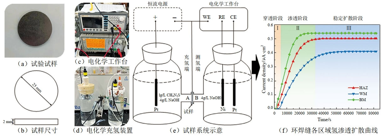 該試驗(yàn)旨在深入分析管線鋼環(huán)焊縫區(qū)域的氫擴(kuò)散特性,涉及母材、焊縫中心和熱影響區(qū)三個關(guān)鍵區(qū)域。在對各組織試樣進(jìn)行切割和研磨拋光后,通過氫滲透試驗(yàn)研究環(huán)焊縫不同區(qū)域氫的擴(kuò)散系數(shù)與表面吸附氫的濃度。在各區(qū)域沿管道壁厚方向制取直徑為25 mm,沿管道軸向厚度為2 mm的薄圓片試樣,用砂紙對圓片雙面進(jìn)行逐級打磨,直至2000#。為了防止試樣陽極一側(cè)發(fā)生氧化反應(yīng)產(chǎn)生非氫原子氧化產(chǎn)生的電流,將試樣的一側(cè)進(jìn)行鍍鎳處理。試驗(yàn)結(jié)果表明,母材晶界的體積分?jǐn)?shù)較大,可提供較寬的氫擴(kuò)散通道,因此母材的有效擴(kuò)散率最高;相比之下,熱影響區(qū)的氫擴(kuò)散系數(shù)小于母材,表明在熱影響區(qū)存在較多氫陷阱,捕獲了部分氫原子,阻礙了氫的擴(kuò)散;焊縫處的氫擴(kuò)散系數(shù)最小,這是由于焊縫中的氫陷阱最多造成的(圖 1)。