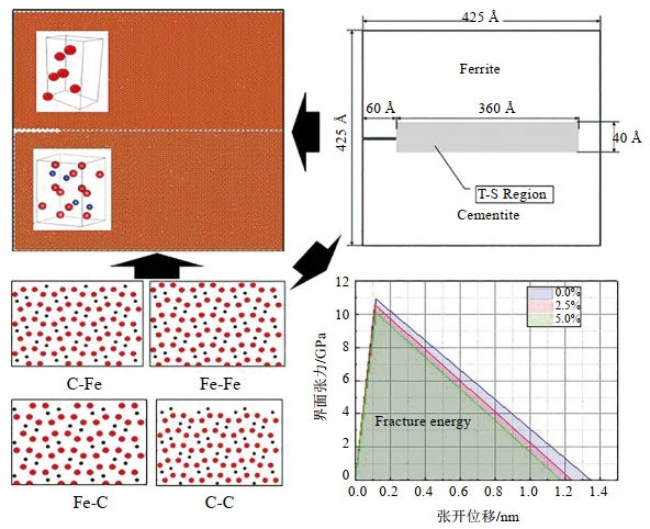 在微觀尺度下,主要通過分子動力學(xué)模擬α-Fe由氫導(dǎo)致的韌性退化直至脆性斷裂的過程,分子動力學(xué)模擬主要從原子層面研究材料在載荷作用下的力學(xué)行為,利用經(jīng)典運(yùn)動方程對一個系統(tǒng)中的N個原子或分子進(jìn)行逐步的數(shù)值求解。對于一個簡單的原子系統(tǒng),每個原子的動力學(xué)過程由牛頓第二定律所控制。高鋼級管線鋼主要含鐵素體或由鐵素體與滲碳體組成的其他微觀組織。鐵素體具有體心立方點(diǎn)陣,而滲碳體具有正交晶格。鐵素體的強(qiáng)度和硬度相對較低,但其在塑性和韌性方面表現(xiàn)出色。在碳鋼和低合金鋼的熱軋(正火)和退火組織中,鐵素體占據(jù)主導(dǎo)地位。利用Atomsk建模軟件建立了尺寸為425 Å×425 Å×28.664 Å的鐵素體/滲碳體片層晶界結(jié)構(gòu),其中上層為鐵素體,下層為滲碳體(圖 2)。通過在模型中隨機(jī)摻入不同數(shù)量的氫原子模擬氫環(huán)境中晶界開裂行為,此外還考慮了滲碳體四種不同終端(C-Fe、Fe-Fe、Fe-C、C-C)的影響。研究結(jié)果表明,隨著氫原子濃度的增加,界面初始損傷對應(yīng)的最大牽引力減小,臨界斷裂能也隨之降低,氫使得材料更易發(fā)生斷裂。
