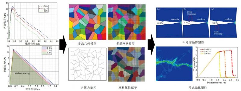 在細(xì)觀層次,泰森多邊形在建立多晶模型方面扮演了關(guān)鍵角色,每個泰森多邊形代表一個晶粒,其邊界相當(dāng)于晶粒之間的界面。通過這種方式,利用泰森多邊形建?梢院啽愕啬M和研究晶粒的大小、形狀和分布,這些都是影響材料性能的關(guān)鍵因素。例如,在金屬材料中,晶粒大小和分布直接影響材料的強(qiáng)度、塑性和疲勞壽命。除晶粒特征外,晶界同樣影響著金屬材料的氫致開裂行為。近幾年,由DUGDALE提出的內(nèi)聚區(qū)模型被諸多學(xué)者用于模擬多晶模型的沿晶開裂行為,晶界損傷參數(shù)可由微觀分子動力學(xué)獲。▓D 3)。通過引入晶體塑性唯象本構(gòu)用于表征多晶體在拉伸載荷作用下的塑性變形演化,使得結(jié)果更加真實(shí)可靠。模擬結(jié)果表明相同位移載荷下,氫使管材的啟裂時間提前,最終裂紋長度增加。引入晶體塑性唯象本構(gòu)后,模型應(yīng)力呈不均勻分布,裂紋擴(kuò)展路徑應(yīng)力相對較大,且隨著氫濃度的增加,材料由韌性斷裂轉(zhuǎn)變?yōu)榇嘈詳嗔选?o:p>