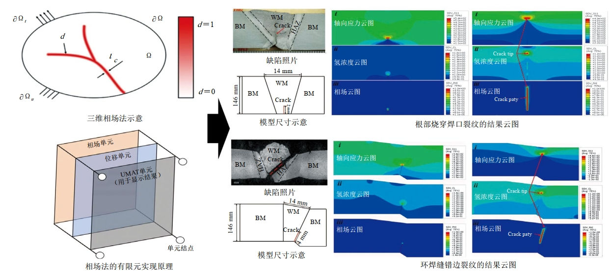 作為一種典型的彌散方法,相場法用一個標(biāo)量場,即相場,描述尖銳裂紋拓?fù)洹O噍^于XFEM、CZM,相場法避免了對不連續(xù)邊界的數(shù)值追蹤,并且不需要預(yù)估裂紋路徑。利用相場法建立焊縫根部燒穿缺陷與錯邊缺陷模型進(jìn)行模擬(圖 4),結(jié)果表明由于裂紋尖端處的靜水應(yīng)力較高,隨著裂紋的擴(kuò)展,氫聚集于裂紋尖端處并且裂紋尖端的氫濃度出現(xiàn)了下降。此外,通過對比兩模型還可以發(fā)現(xiàn),不同的缺陷類型導(dǎo)致了裂紋擴(kuò)展路徑的變化,模擬結(jié)果與實(shí)際相符。
