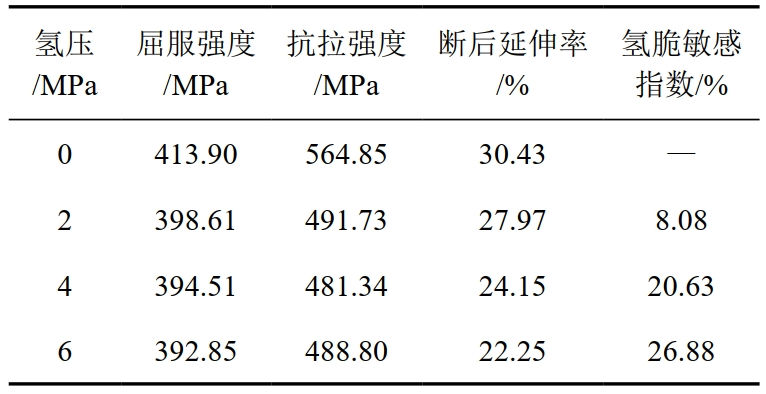 根據(jù)不同氫壓下X52管線鋼的應力—應變曲線,對應不同氫壓下試樣的屈服強度、抗拉強度、斷后延伸率和氫脆敏感指數(shù)(圖 3、表 1)可以看出,隨著氫壓不斷增大,試樣屈服強度略有降低、抗拉強度和斷后延伸率均減小,氫脆敏感性增大。當氫壓為6 MPa時,X52鋼氫脆敏感指數(shù)為20.88%。