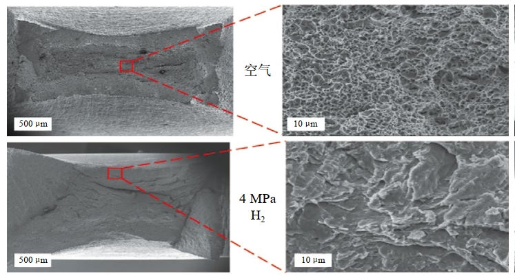 分析斷口微觀形貌(圖 4),X52鋼在空氣環(huán)境中進行試驗后斷口呈典型韌性斷裂特征,斷口中心呈等軸韌窩,韌窩大小不一。但隨著氫壓的上升,拉伸斷口由韌性斷裂向解理斷裂轉變,解理區(qū)域從外側向中心處延伸,出現(xiàn)解理臺階狀特征,與慢速率拉伸結果一致。