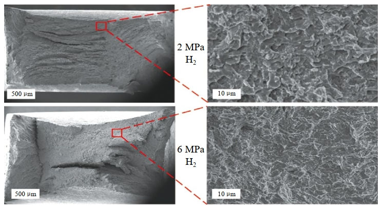 (1)對比2 MPa、4 MPa、6 MPa氫壓下的慢速率拉伸試驗結果,X52管線鋼的屈服強度略有降低,抗拉強度和斷后延伸率均減小,氫脆敏感性增大,氫脆敏感指數(shù)分別為8.08%、20.63%、26.88%。