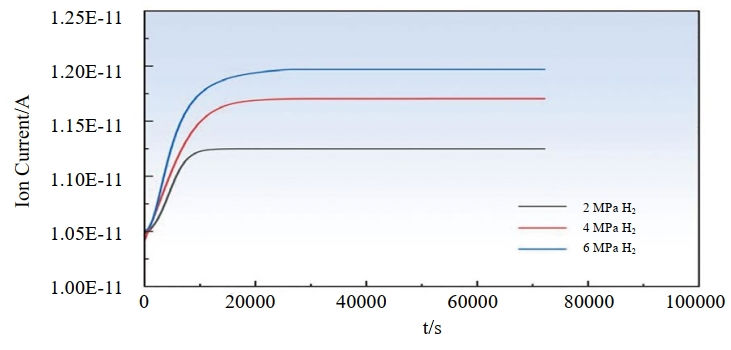 采用氫含量測試儀HTDS-003對X52管線鋼的氫含量進行測定。將X52鋼切割成尺寸為20 mm×10 mm×3 mm的塊狀試樣,使用SiC砂紙打磨至2500#,進行機械和電解拋光,去除表面殘余應力,記錄試樣重量。分別在氫氣壓力為2 MPa、4 MPa、6 MPa的條件下對試樣進行預充氫,充氫時間為24 h。提前對測試儀器進行氫氣標定,以便于充氫完成后將試樣在1 min內(nèi)裝入設備并進行測定。測定溫度范圍為室溫至800℃,升溫速率為100℃/h。