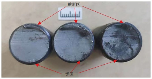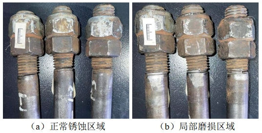 斷口呈典型疲勞斷裂特征,斷口平齊。斷口表面存在三個(gè)特征區(qū)域:疲勞源區(qū)、裂紋擴(kuò)展區(qū)和瞬斷區(qū)[2]。疲勞源區(qū)位于螺栓外表面,較為集中;擴(kuò)展區(qū)光滑且有橫紋,面積較大;瞬斷區(qū)位于疲勞源區(qū)對(duì)面。通過(guò)對(duì)比分析失效螺栓螺桿外表面和斷口啟裂位置,可以發(fā)現(xiàn)3件失效螺栓的疲勞源區(qū)位置螺桿外表面為正常銹蝕狀態(tài),而疲勞斷口的瞬斷區(qū)螺桿外表面存在局部磨損(圖 3)。