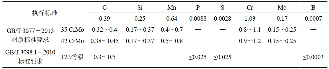 化學(xué)成分分析。依據(jù)GB/T 3098.1―2010產(chǎn)品標(biāo)準(zhǔn)對(duì)3件失效螺栓桿體進(jìn)行取樣化學(xué)成分分析,試驗(yàn)標(biāo)準(zhǔn)為GB/T 4336―2016《碳素鋼和中低合金鋼 多元素含量的測(cè)定 火花放電原子發(fā)射光譜法(常規(guī)法)》,分析設(shè)備為ARL4460直讀光譜儀。參照GB/T 3077―2015《合金結(jié)構(gòu)鋼》標(biāo)準(zhǔn)要求,該批螺栓桿體應(yīng)為合金結(jié)構(gòu)鋼,材質(zhì)介于35 CrMo和42 CrMo之間,為40 CrMo。螺栓化學(xué)成分分析結(jié)果符合GB/T 3098.1—2010標(biāo)準(zhǔn)中10.9和12.9緊固件性能等級(jí)要求(表 1)。