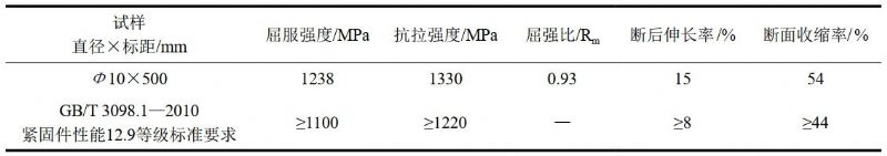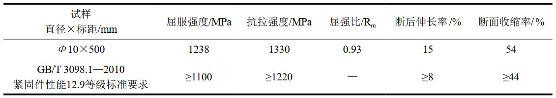 拉伸試驗(yàn)。在螺栓桿體上沿縱向取圓棒狀試樣進(jìn)行拉伸性能試驗(yàn),試樣標(biāo)距段直徑為10 mm,標(biāo)距段長(zhǎng)度為50 mm。試驗(yàn)在UTM5305材料試驗(yàn)機(jī)上進(jìn)行,執(zhí)行GB/T 228.1―2021《金屬材料 拉伸試驗(yàn) 第1部分:室溫試驗(yàn)方法》,參照GB/T 3098.1—2010進(jìn)行結(jié)果比對(duì),符合標(biāo)準(zhǔn)中12.9緊固件性能等級(jí)要求(表 2)。