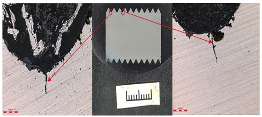 金相檢驗(yàn)。在失效螺栓中選取一件試樣對(duì)斷裂區(qū)域(圖 4)進(jìn)行金相檢驗(yàn),試樣編號(hào)1#。裂紋源區(qū)附近齒根位置存在微裂紋(圖 5)。分別對(duì)螺紋牙頂、齒根及螺栓心部進(jìn)行金相檢驗(yàn),未見(jiàn)異常。螺栓金相組織為回火索氏體、晶粒度等級(jí)為10.0。
