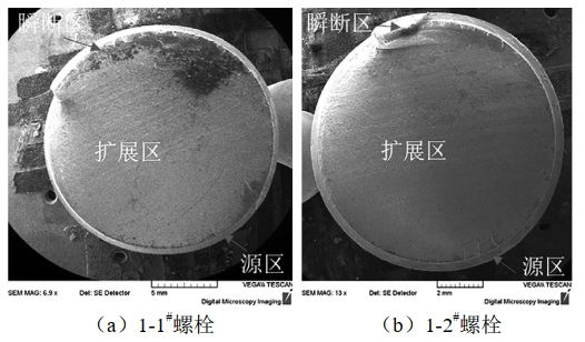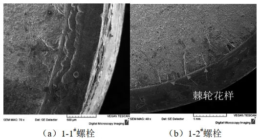 外觀檢驗(yàn)發(fā)現(xiàn)失效螺母距螺桿端部距離不一,螺栓末端露出不同螺紋牙數(shù),可推斷出清管器上螺栓初始緊固程度存在差異。失效斷裂發(fā)生在螺紋加工末端齒根位置,螺栓桿體表面未見(jiàn)塑性變形,但存在輕微局部磨損,根據(jù)螺栓軸向長(zhǎng)度推測(cè)磨損位置對(duì)應(yīng)螺栓徑向承載位置。斷裂部位附近螺紋齒根部存在微裂紋,斷口呈典型疲勞斷裂特征。